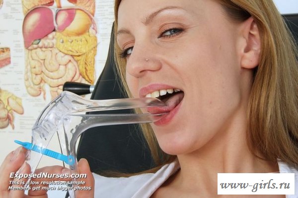 Развратница в свой обеденный перерыв решила зайти в гинекологический кабинет и сразу же после того как она оказалась в этом кабинете, милашка сняла с себя трусы и теперь светит киской. Раздетая медсестричка показывает пизду после чего становится раком…