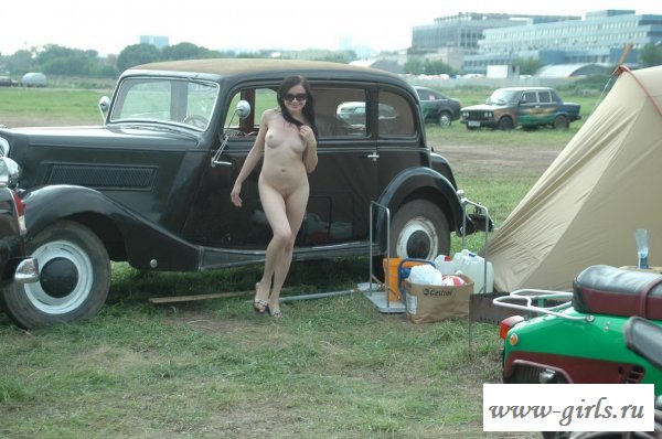 Выставка ретро машин запомнилась не только редкими коллекционными тачками, но и ещё тем, что бесподобная обнажённая чикса гуляет без одежды среди публики. Понятное дело, что на её раздетые интимные прелести обязательно бросит свой взгляд каждый, кто оказался в данной ситуации рядом с ней. К нашему же счастью, её похабную выходку засняли на фотоаппарат, что и позволяет тоже получить неистовые эмоции от её голых сисиечек и забавной попочки с потрясающими булочками.