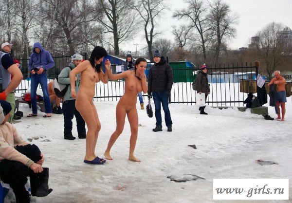 Ничего не приходится больше делать, как просто внимательно пялиться со стороны на то, как обнажённые девахи сейчас на публике ныряют в прорубь. Здесь одновременно дух захватывает сразу от нескольких вещей, конечно же от безумного холода и их соблазнительных раздетых тел. Ведь устоять перед таким искушением уж точно далеко не каждый сможет. Поэтому стоит обязательно не только полюбоваться голыми девушками, но и высказать своё удовлетворение в их адрес положительными словечками.