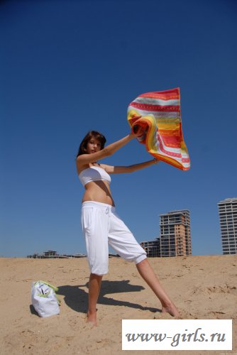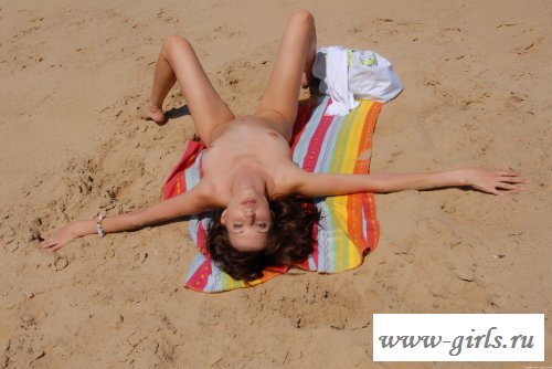 Рано утром брюнетка пришла на пляж, чтобы занять места, а то потом сюда не влезешь. Курортница одна на песочке, она стелит подстилку, чтобы в писю не насыпало и ложится на нее голышом. Все-равно пока никого нет, ее сиськи успеют загореть. У сучки хорошее тело.