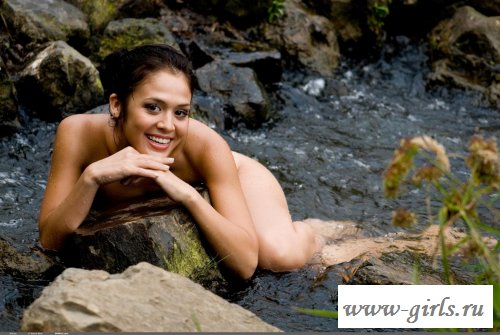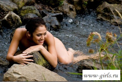 Эта детка купается в горной речке, куда приехала на отдых вместе со своим парнем и теперь часто там проводит время на пляже. Сегодня она намочила своё обнаженное тело и теперь сидит Голой попой на камнях, подставляя всю себя солнечным лучам.