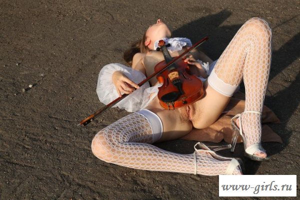 Миленькая молодая девочка сняла с себя трусики и отправилась загород, для того чтобы прямо там начать творить красивую музыку. Голая скрипачка с раскрытой пиздой присела голой попкой на клетку с птичками и после этого начала достаточно красиво играть на своей скрипке.